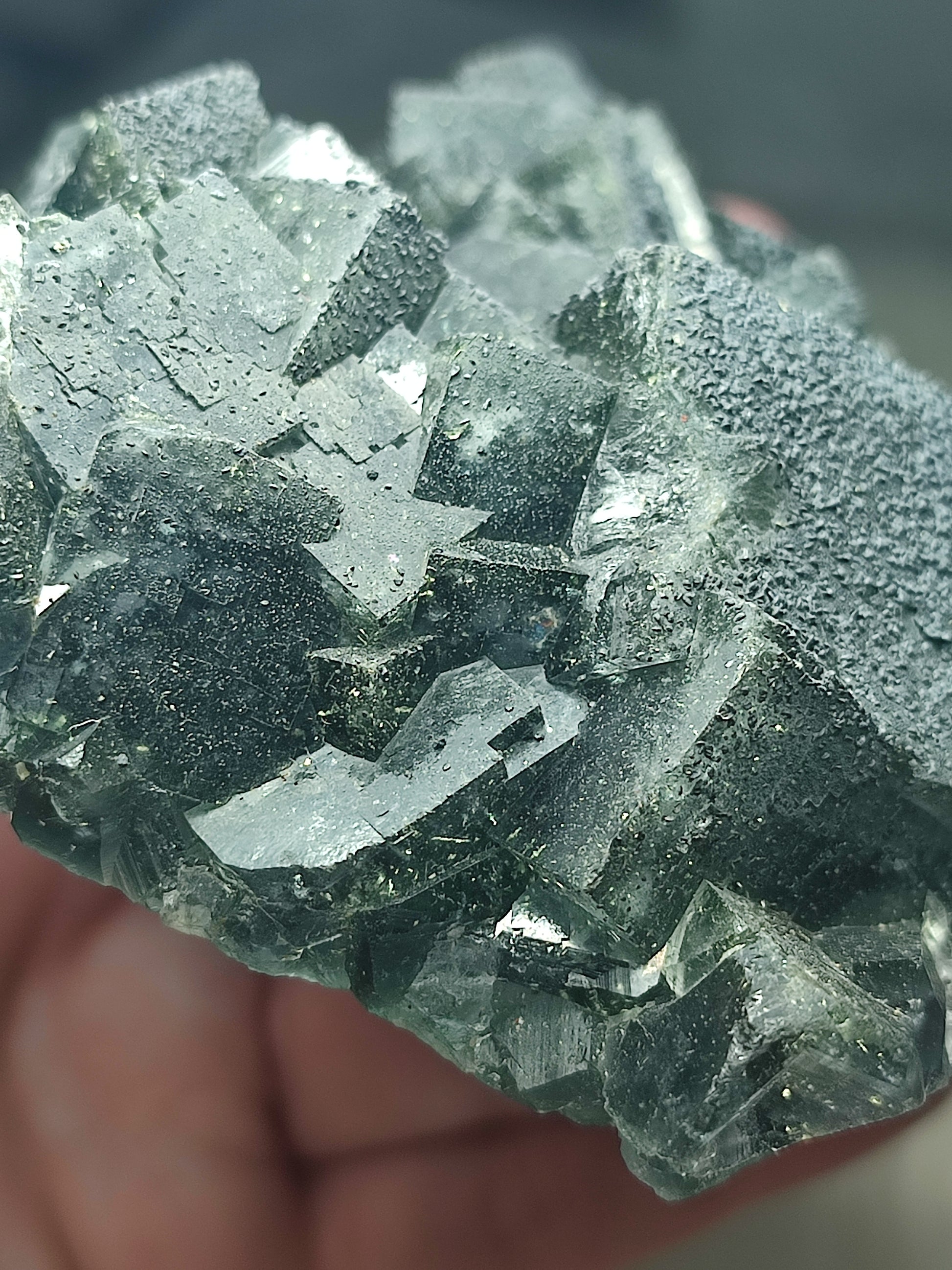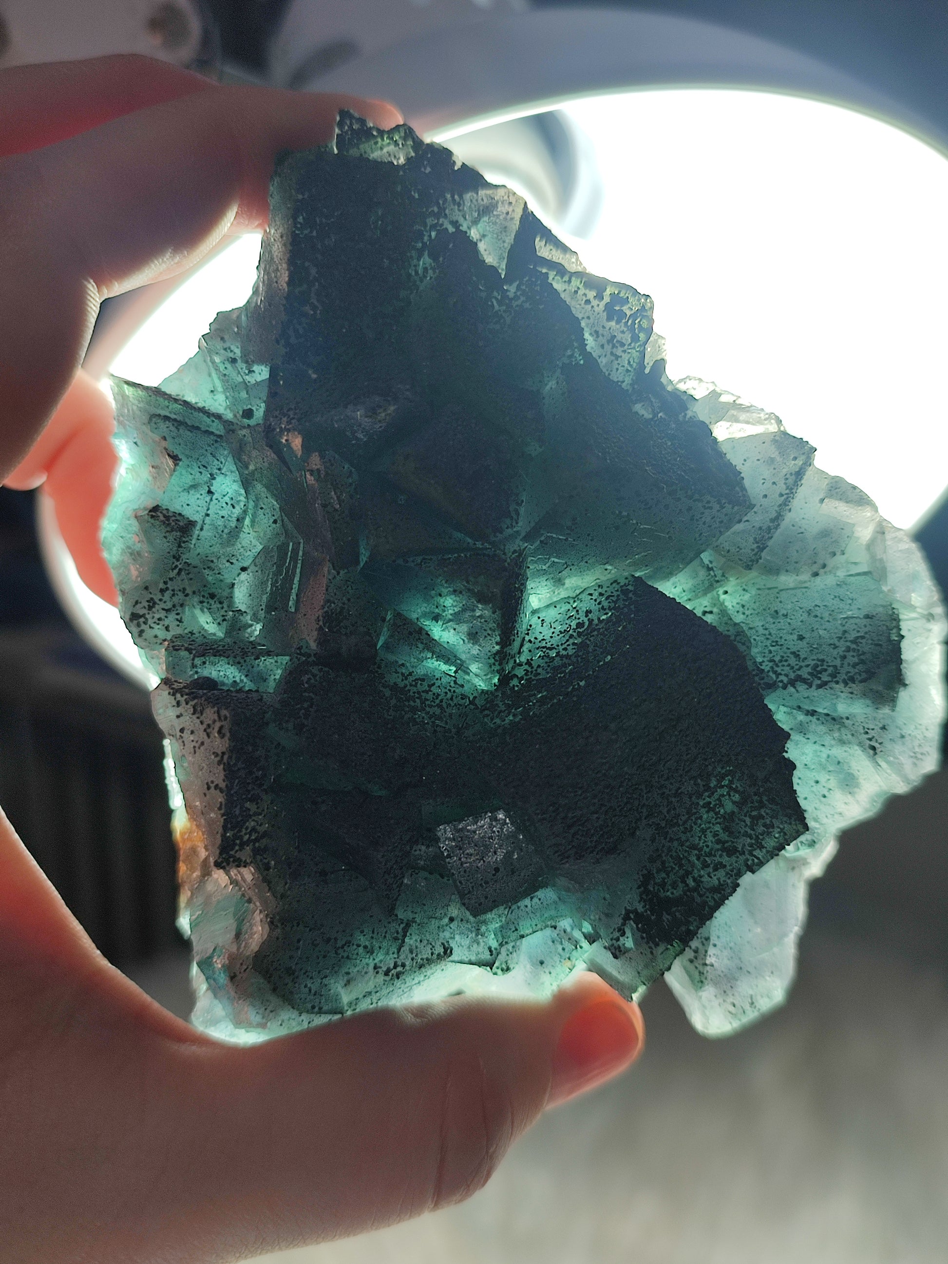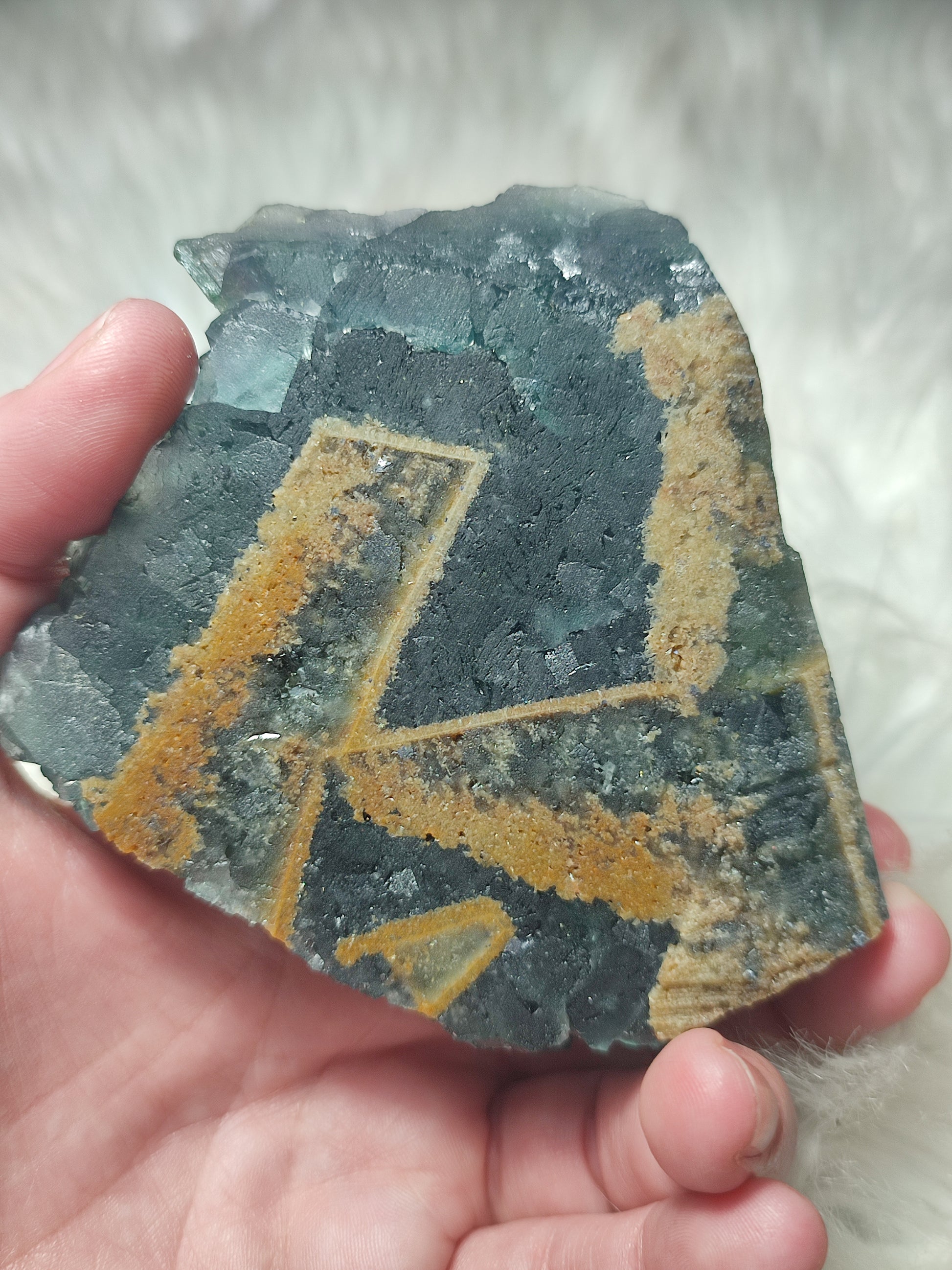 Tiene un color principal lila que lo sobrepone el azul dando este color verde esmeralda tan bonito y además contiene inclusiones de pirita y oxidaciones.