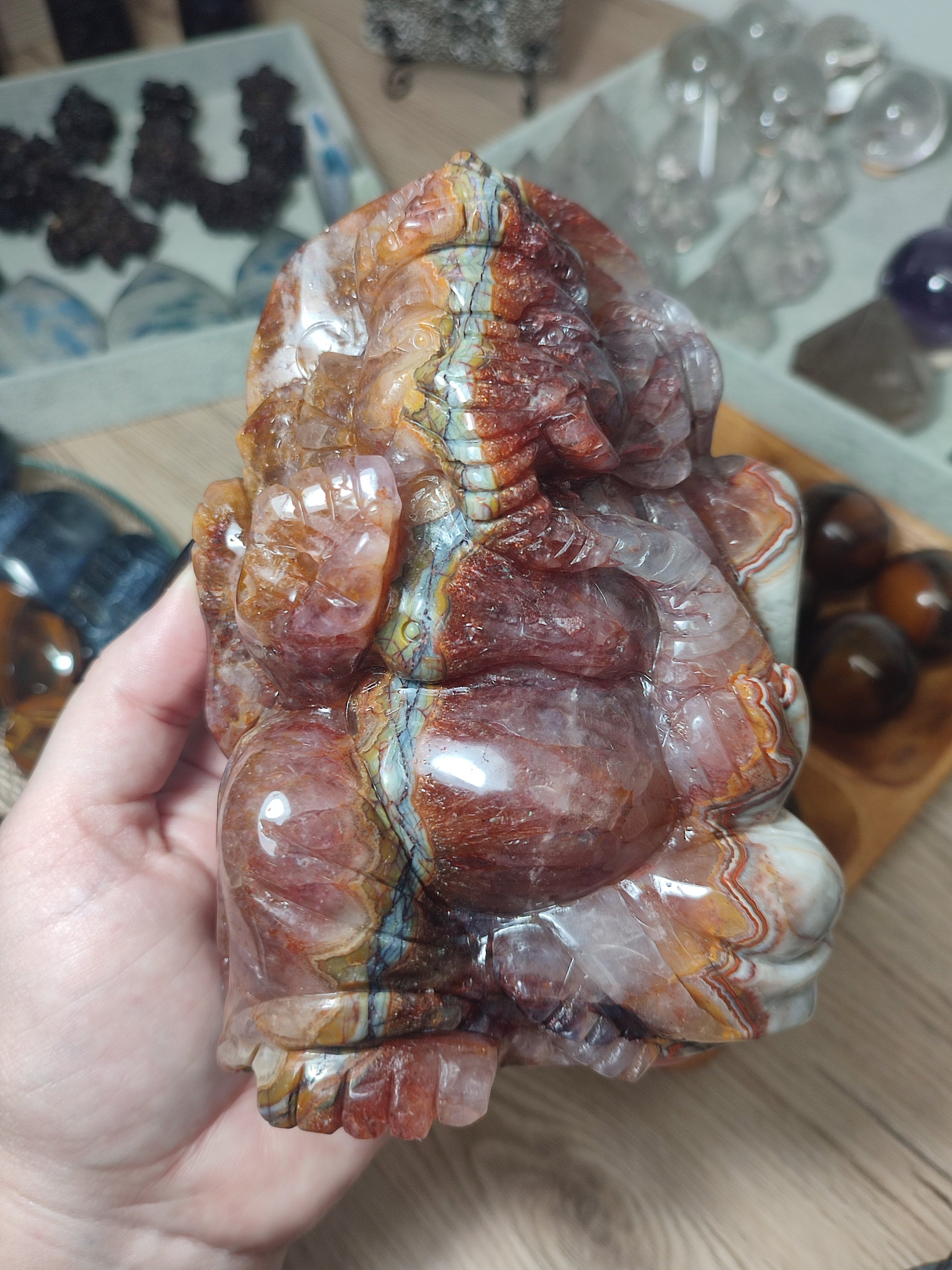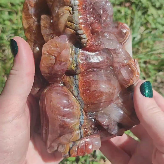 Figura tallada de ágata con amatista con inclusiones de sanador y hematoide, tallada a mano con bonitos detalles y minerales de alta calidad.