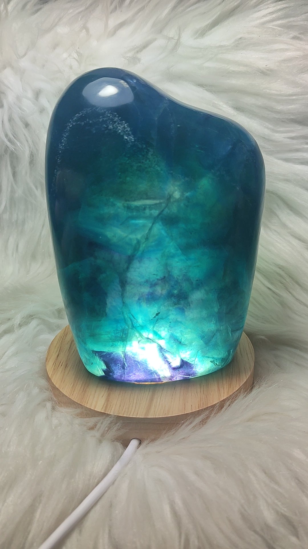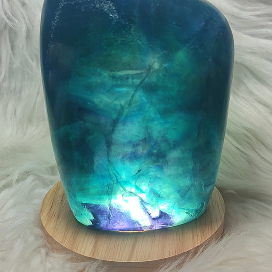 Fluorita muy especial en tonalidades azules, verdes y lila con sedimento de lodo y pirita en su interior y exterior. También tiene zonas con copos snowflake.