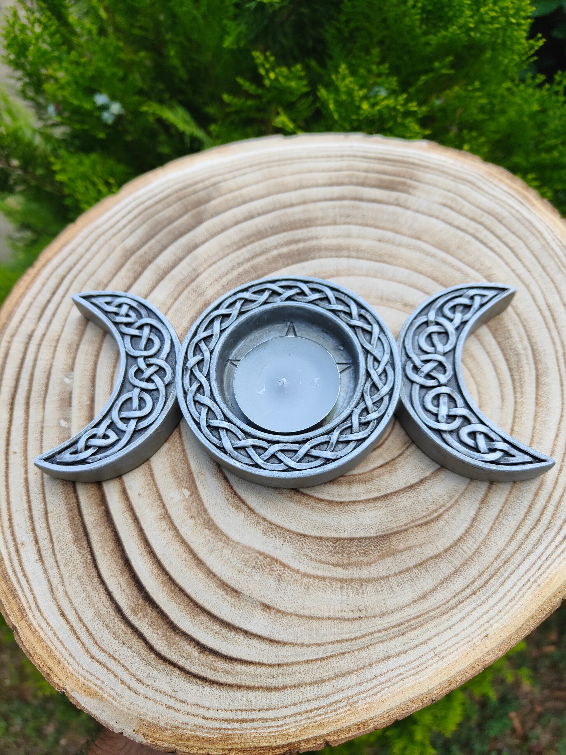 Para tu altar un porta velas inspirado en la Triple Diosa. Rinde homenaje a la doncella, madre y anciana mientras te dejas cautivar Con el baile de la llama. Con un diseño entrelazado y eleborado en resina de alta calidad, pintado a mano.