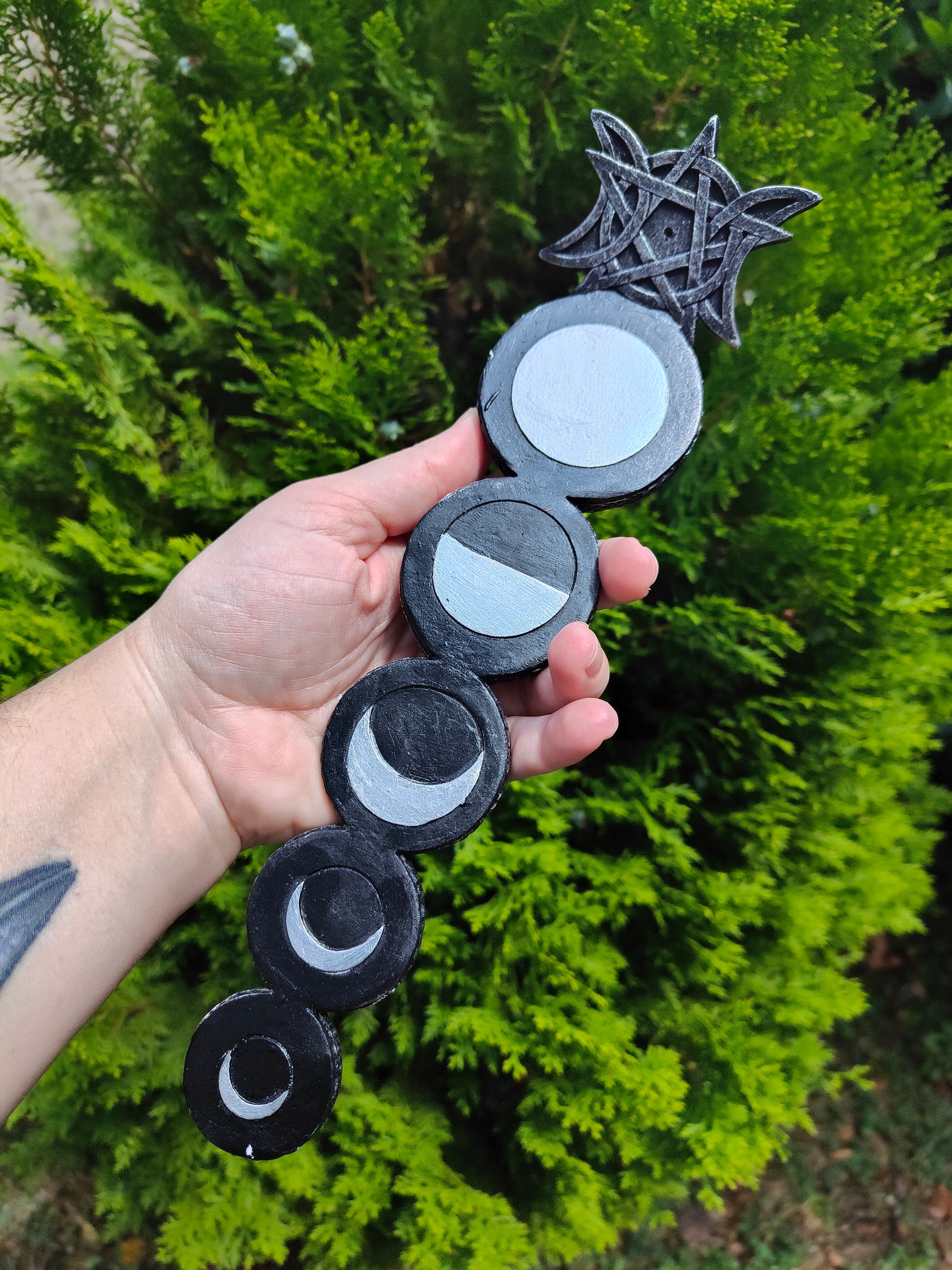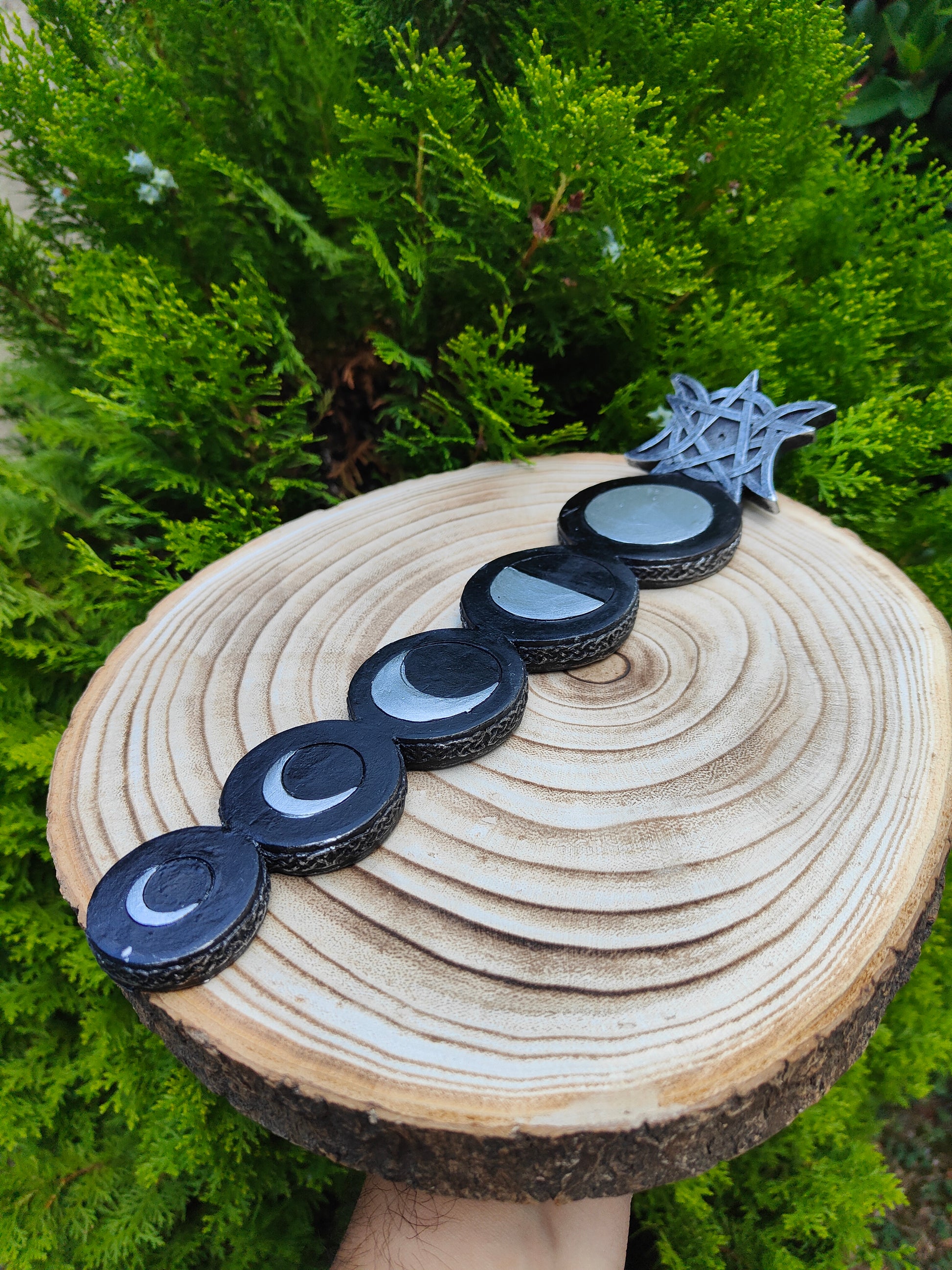 Soporte para varillas de Incienso con motivos de las fases lunares, el símbolo de la magia y la Triple diosa. Elaborado en resina y pintado a mano.