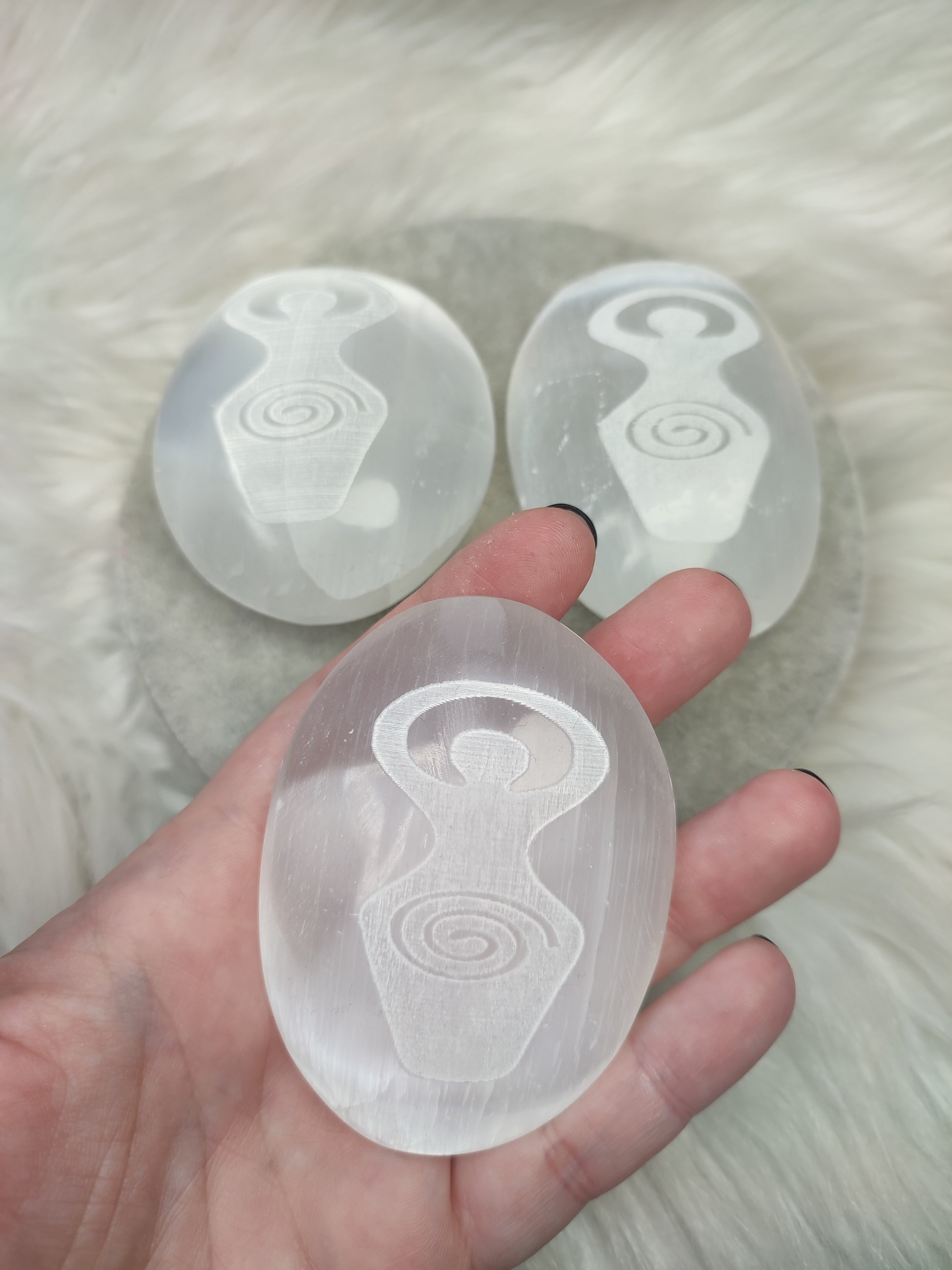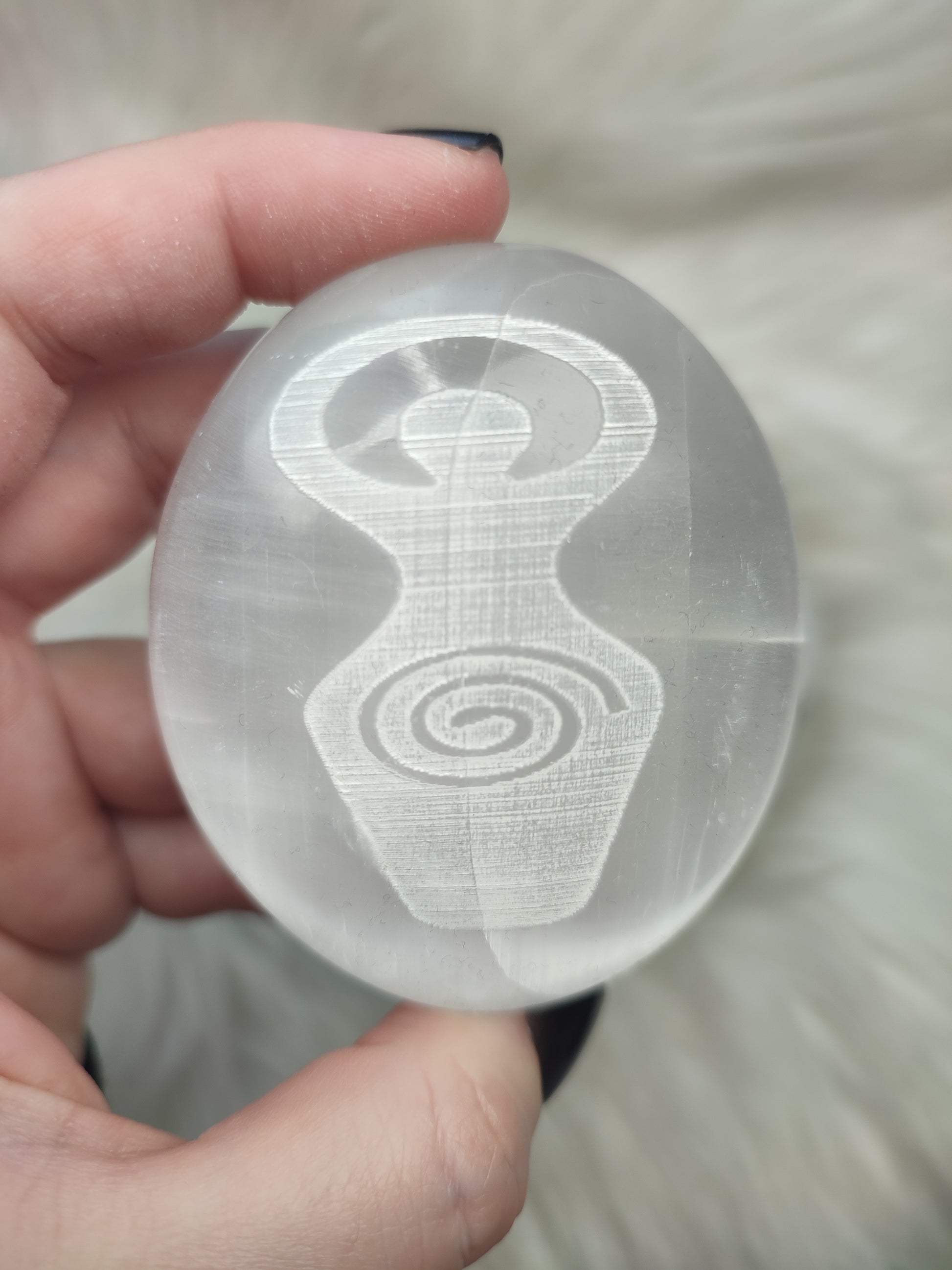 Rodado de selenita con diosa espiral tallado